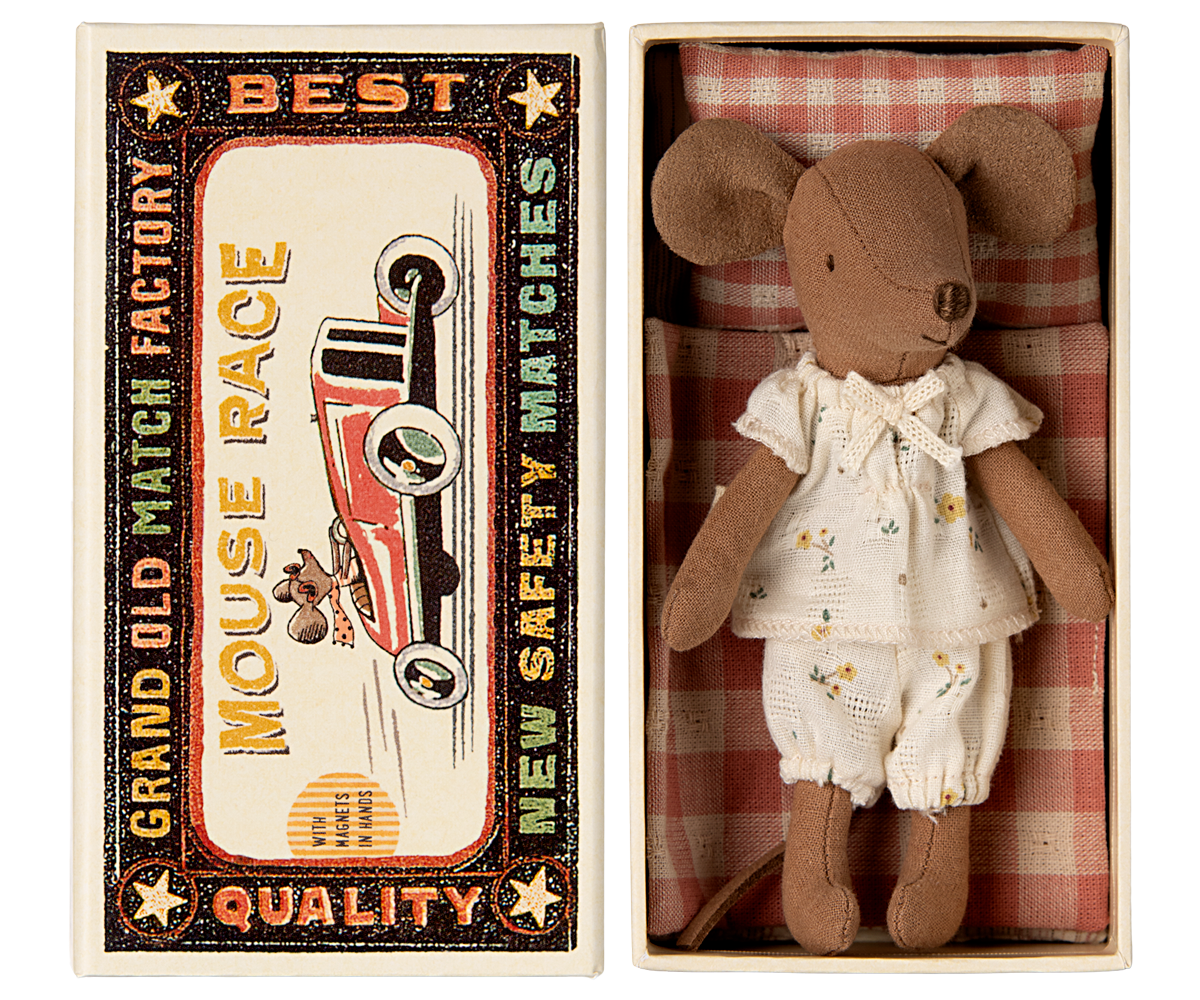 Introducing Big Sister mouse in her cozy matchbox home! Made with soft fabrics and unique prints, she's ready for hours of play. Add accessories to extend the story. The perfect gift for sparking imagination and playtime.