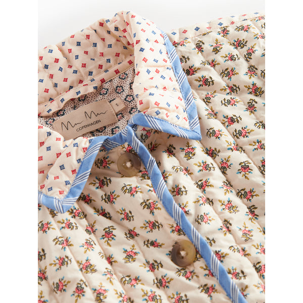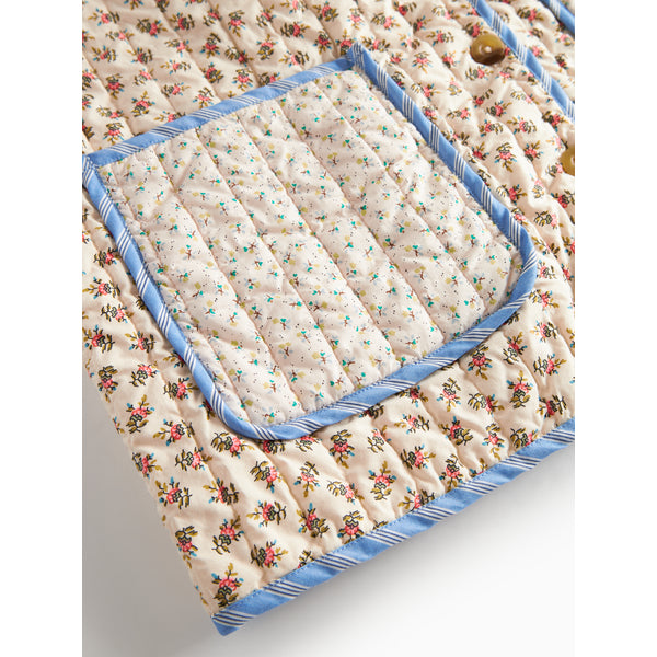 Quilted jacket for women with various floral patterns and contrast-colored piping. The jacket has a collar, two large spacious pockets, and button closure at the front. The jacket is perfect for transitional weather.