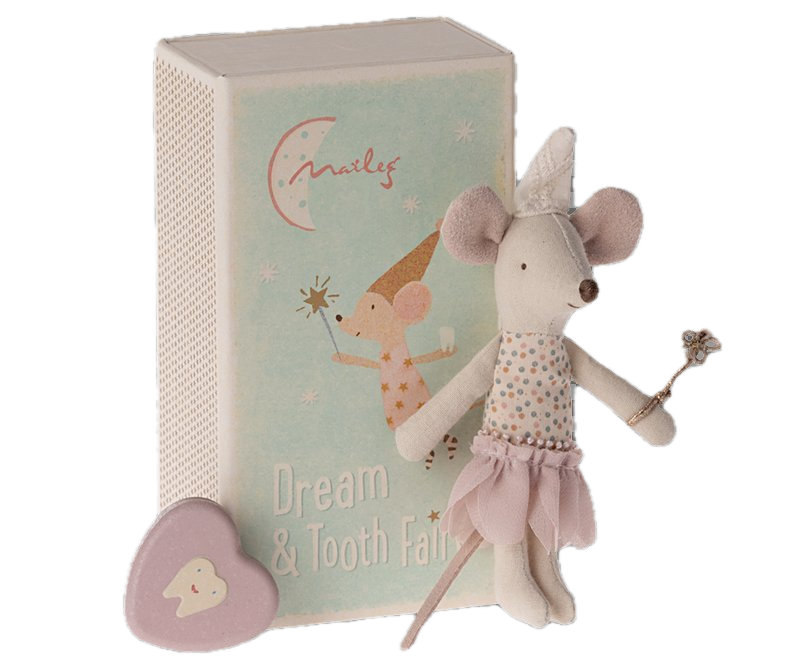 This Tooth Fairy Mouse from Maileg is perfect for bringing a touch of magic to your child's room. The handcrafted design features soft fabric, a bell, and a gold braid to keep those teeth safe in style. With its detailed features, this mouse brings a sense of wonder and delight to any bedroom.