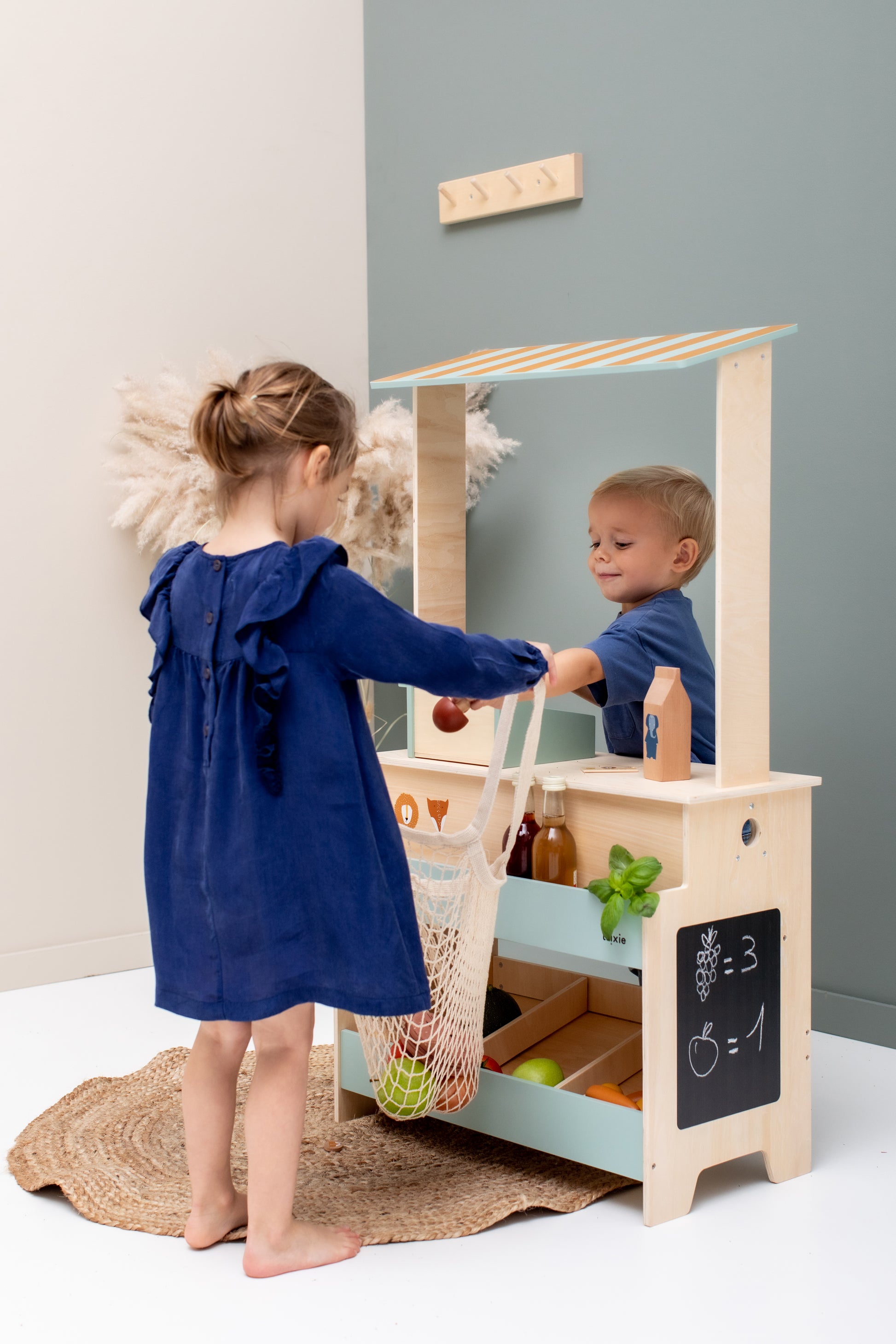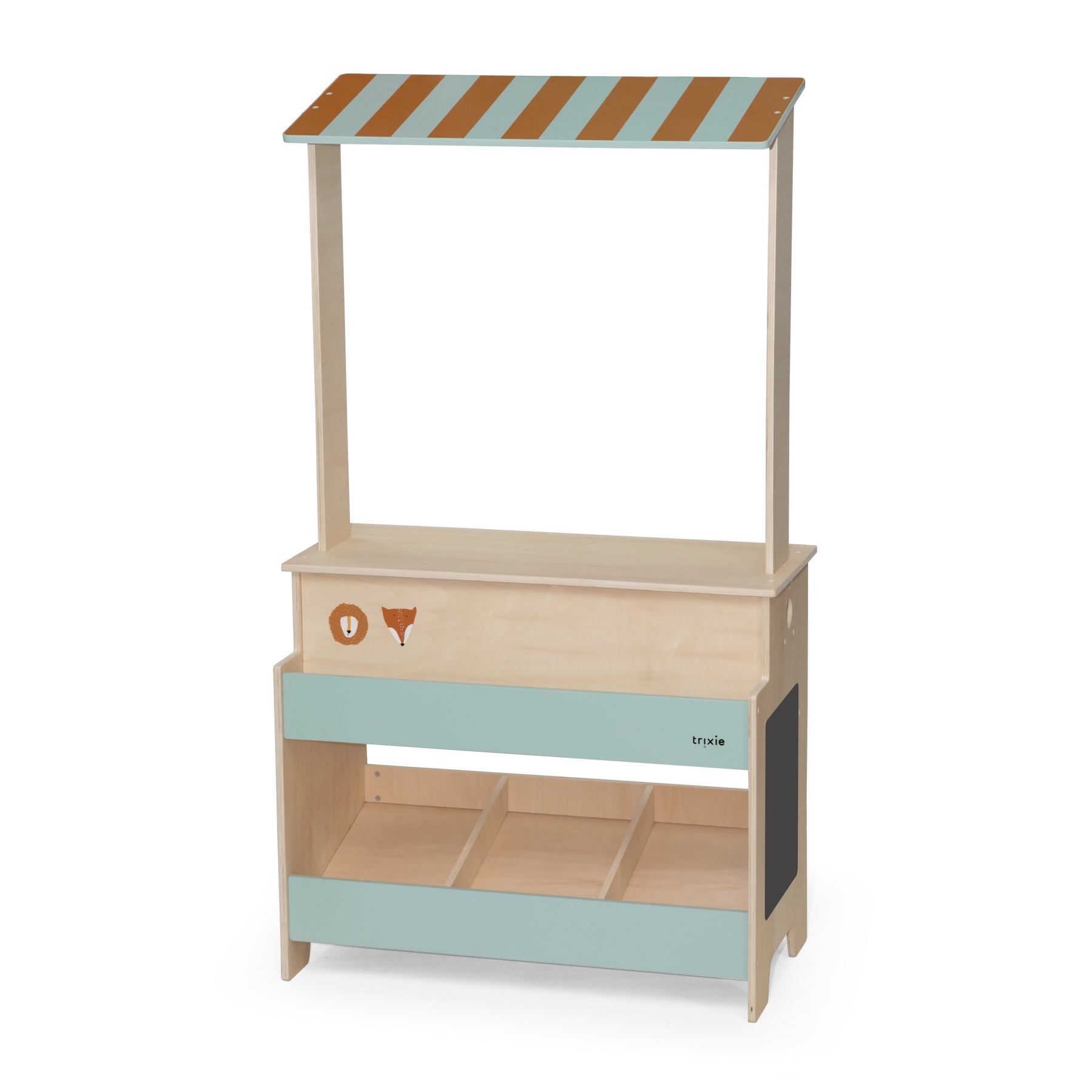 Shop, play, and create with our Wooden Market Stand! Display your products beautifully and ignite your imagination. With its convenient chalkboard for special offers, this market is perfect for hours of enjoyment.
